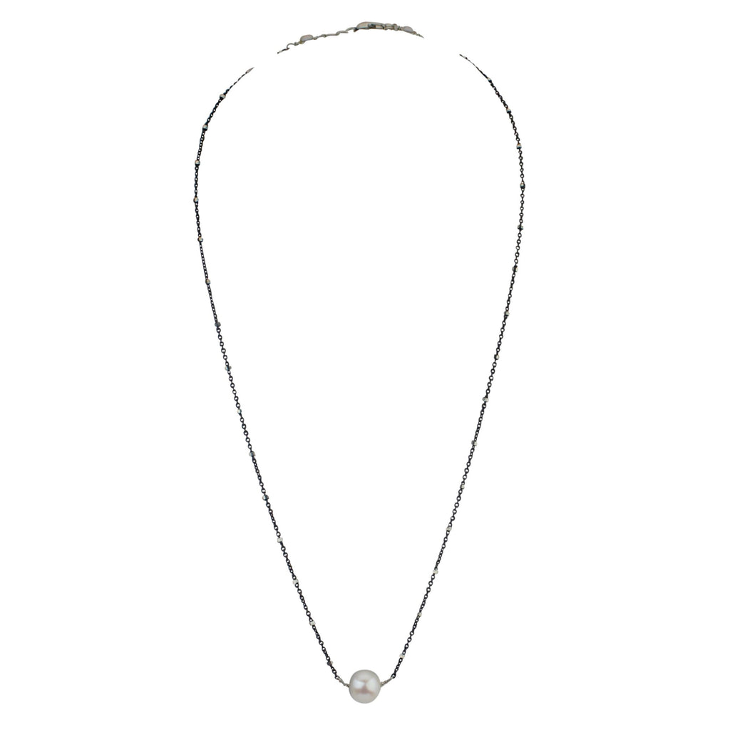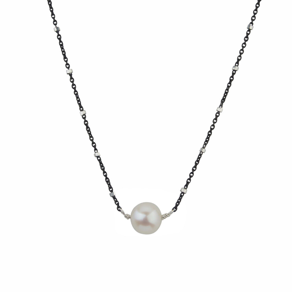 A single, exquisite round pearl is wire wrapped on an oxidized sterling silver chain. This necklace offers a chic and elegant finish to any outfit. A beautiful pendant for any casual or professional woman, but especially for bridesmaids at black & white wedding, sorority girls, a woman in your family, or for a new graduate. Clasp is a sterling silver lobster clasp with a 2" extender chain.